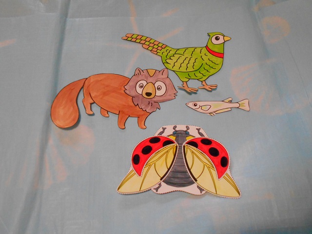 2つ目。キジ・タヌキ・メダカの切り抜き。3つ目。テントウムシ。羽部分を重ねた。